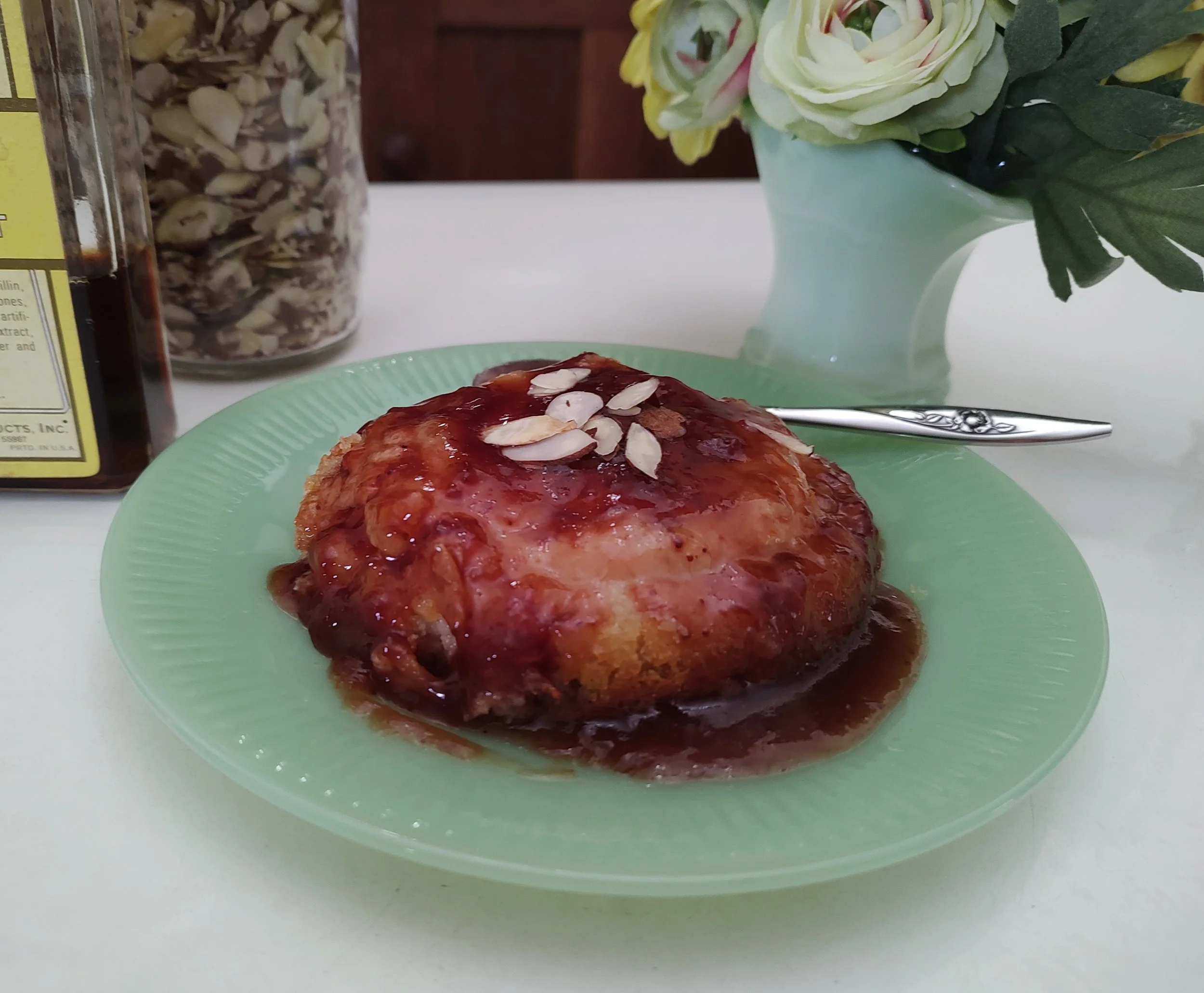 I enjoyed my leftover bread crumbs in almond puddings. I made a few adjustments to the recipe—blanched almond flour and slivered almonds bring this dessert together quickly. And, although many World War II recipes use very little seasoning, I thought the puddings would taste better with the addition of vanilla and almond extracts. Any type of red jam would work but cherries are a natural complement to almonds. Cherry jam takes these puddings right over the top.