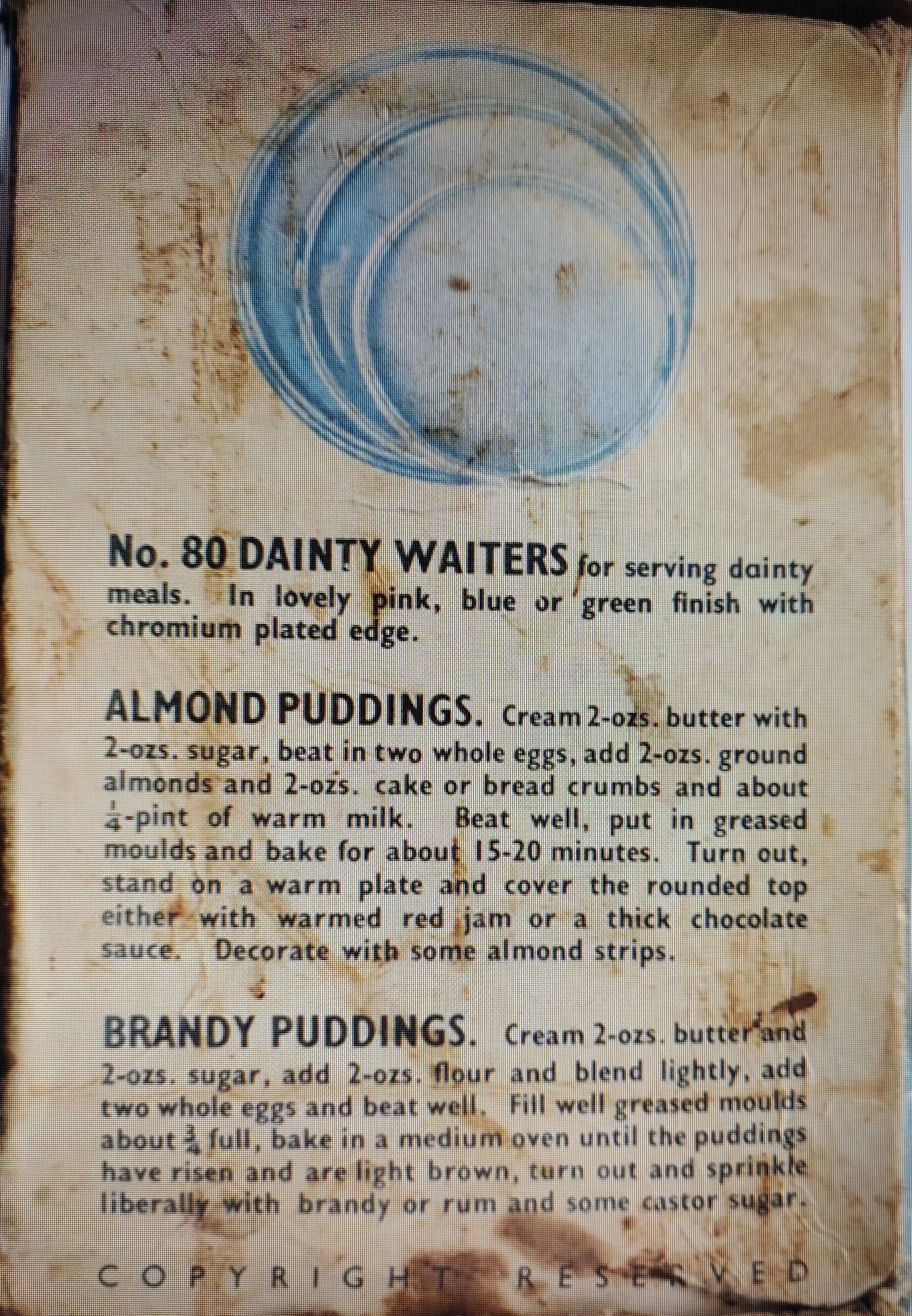 “Dainty Waiters” were advertised on the box that is obviously too small to contain one of those serving dishes. But two tempting recipes follow. I decided to try the first one for Almond Puddings. The recipe has simple ingredients and took only minutes to prepare and bake. The result was a delectable dessert. This recipe is a winner!