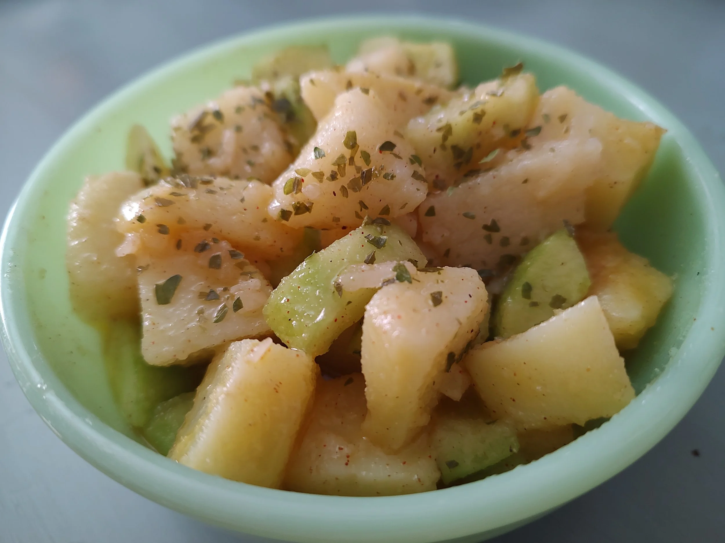 This salad could have been popular during the 1940s as it is mainly vegetables—potatoes and cucumber—but the amount of oil would have posed a problem for homemakers in many parts of Europe. In such a case, the dressing might have been halved and a bit of mayonnaise added to complete the salad. Also, other vegetables such as shaved radish or carrot, or minced celery, could be added. During winter, when fresh garden produce is limited, this salad is a refreshing option with a heavier meat like roast beef or chicken.