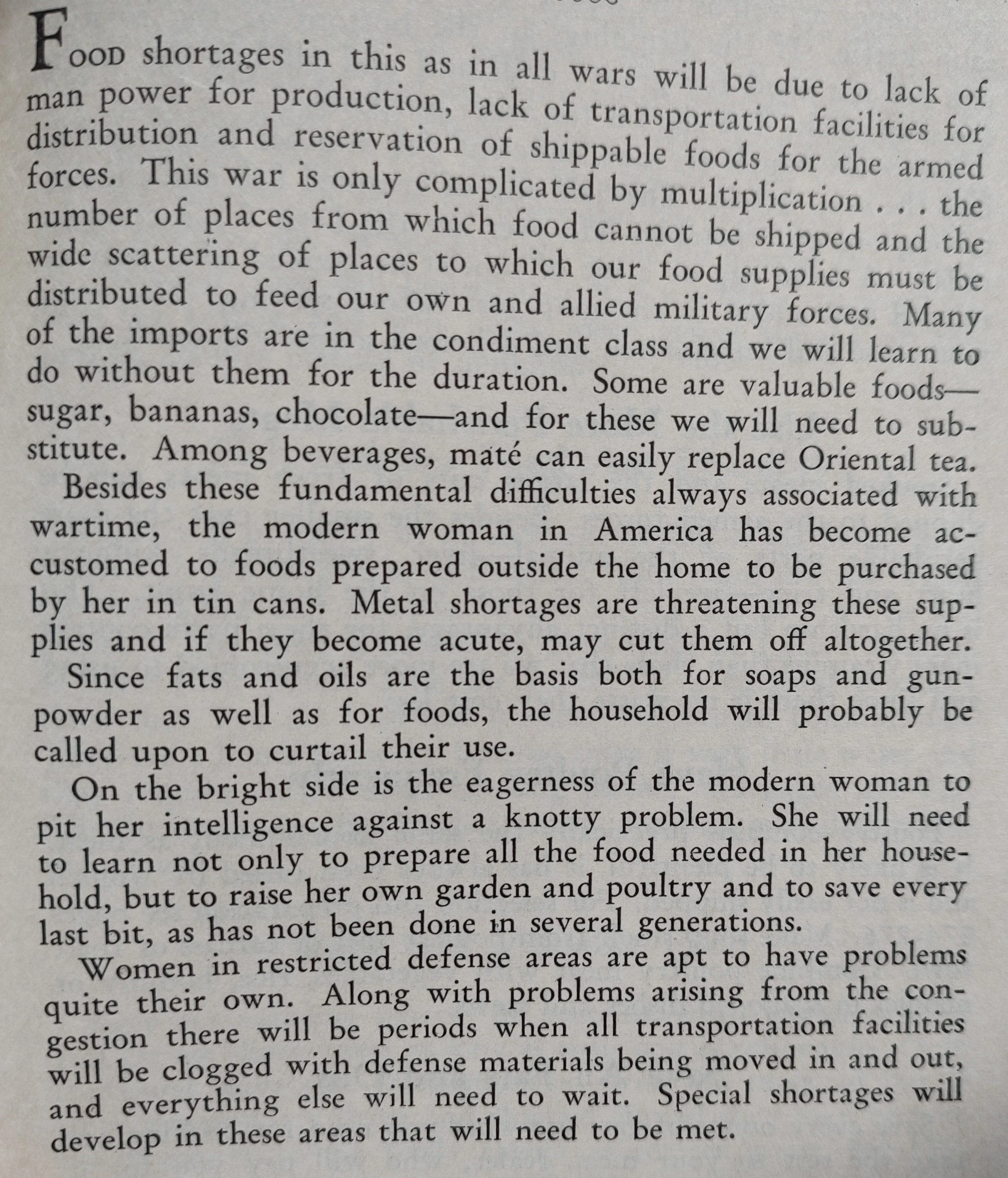 Another chapter on Wartime Cookery advises how to use leftovers or make substitutions for items no longer available. The introduction to this chapter is a window into the world of the wartime homemaker: