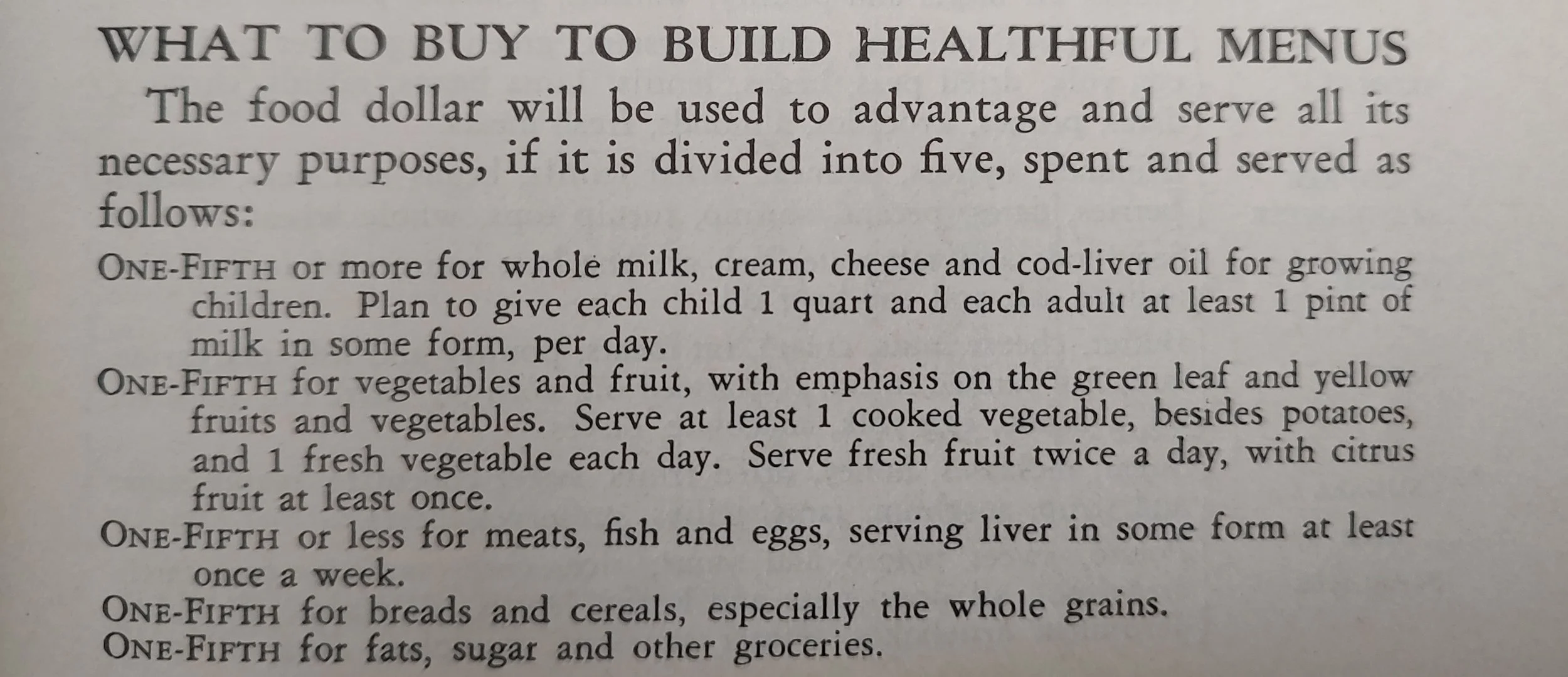 “Every meal,” it says, “should be planned to meet first the needs of the youngest and weakest member of the family.” Points to keep in mind when planning menus include the staying quality of food, the most satisfactory conditions of digestion and elimination, not including too much sweet food or too much meat and eggs, the texture of food, the appearance of food and the flavor of food.