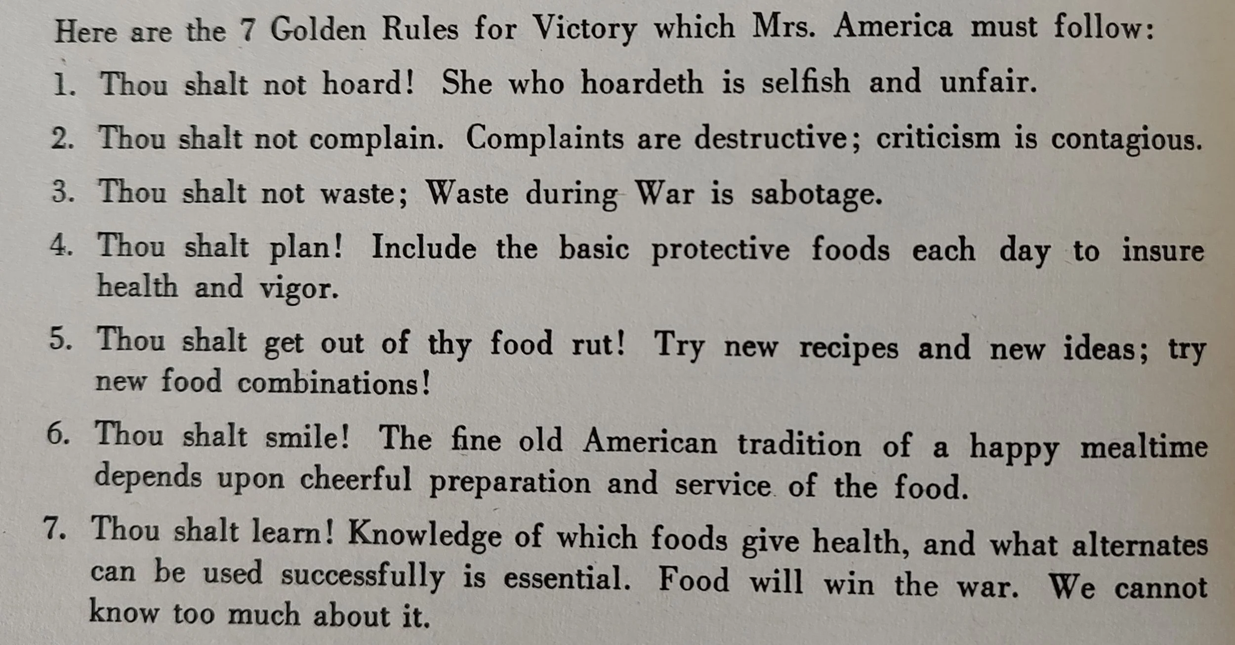 Coupon Cookery’s strategy was to plan menus before shopping, using a chart to list grocery items along with whatever ration coupons would be needed. It included 10 pages of rationed ingredients! But rather than buying ingredients without a shopping list, it recommended planning nutritionally and with a willingness to try new recipes or combinations. Prudence Penny shares the 7 Golden Rules for Mrs. America: